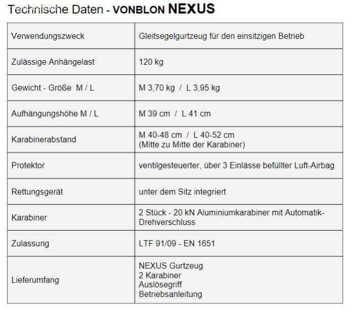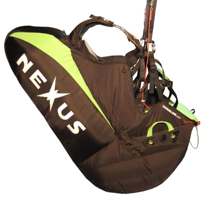 Vonblon NEXUS Gurtzeug ist ein sehr leichtes und bequemes Wendegurtzeug, das mit einem neuartigen 14G Airbag ausgestattet ist. (14G ist ein Spitzen-Wert!!)Beim NEXUS ist der Rucksack so konzipiert, dass damit auch ein normaler Gleitschirm transportiert werden kann, dennoch lässt sich der Sack durch sein neuartiges Zurrsystem auf ein kleines Gleitschirmformat komprimieren.